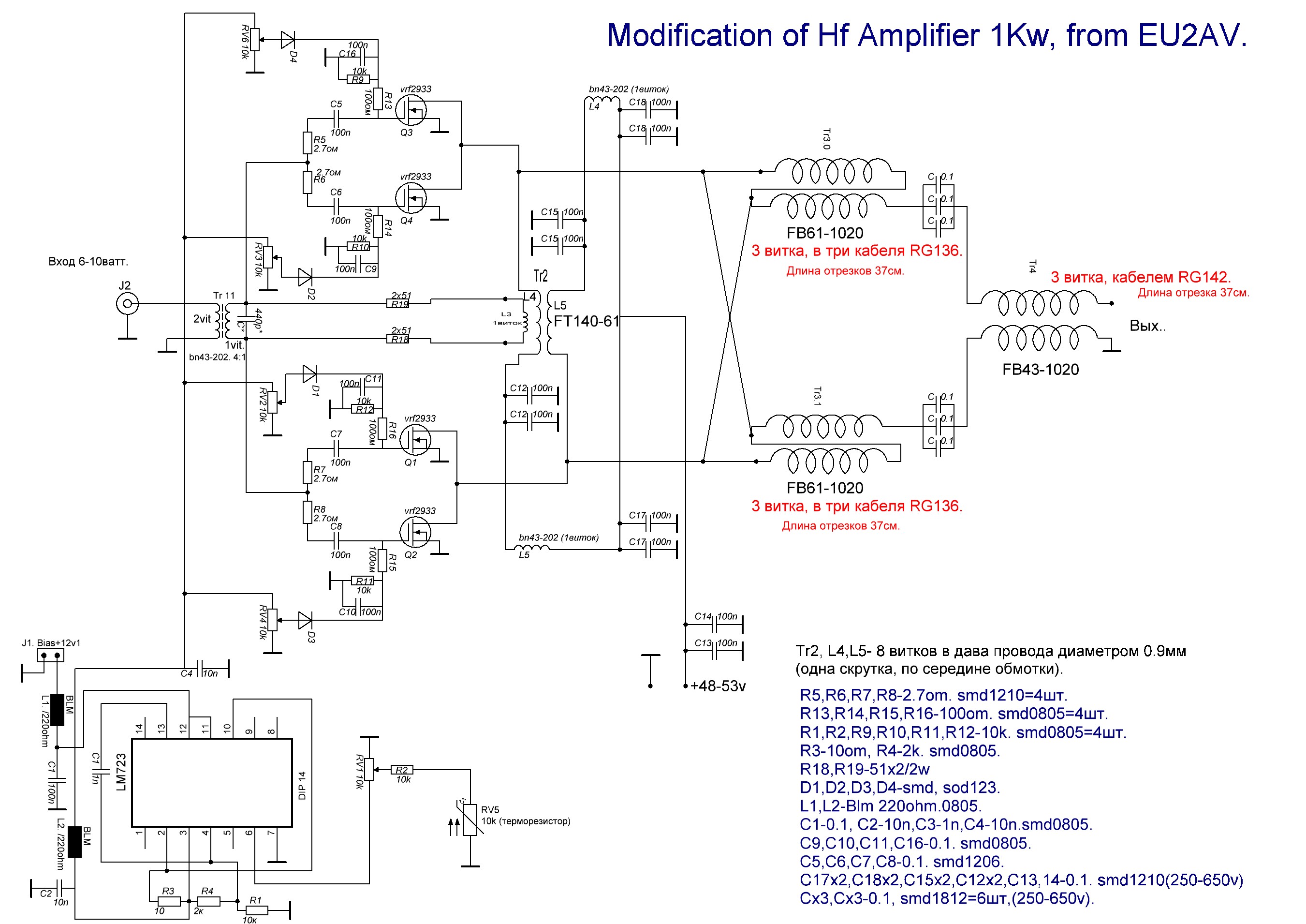 Уже два года, как повторил конструкцию усилителя еб-104ру, на четырех vrf2933! Усилитель за два года показал высокую надежность, полностью удовлетворял мои требования, весомый не достаток заключался в ксв, в маем усилителе дополнительно стоит ксв измеритель между усилителем и фнч, для более жесткого контроля работы выходных транзисторов, и возможности реализации защиты выходных каскадов . Получалось следующее ксв отлично соответствовал в диапозоне до 10мгц , на 10м ксв составлял значение (ксв)=3, на нагрузке 50ом, по этому своим согласующим всегда строился по ксв-метру =1(который установлен между РА, и фнч), соответственно ксв измеритель на выходе (фнч) при этом показывал значение 2.5-3.5.
