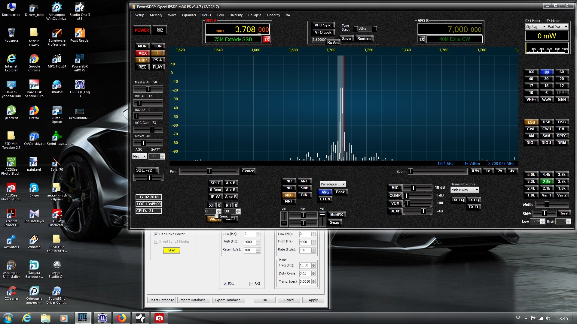 В любом случае очень трудно было получить такой результат, в первом исполнении (hiqsdr) с драйвером на рд16.. транзисторах было -30дб, в ссб 40-45дб. Забыл пометить, точно не помню это было в районе около 900ват.