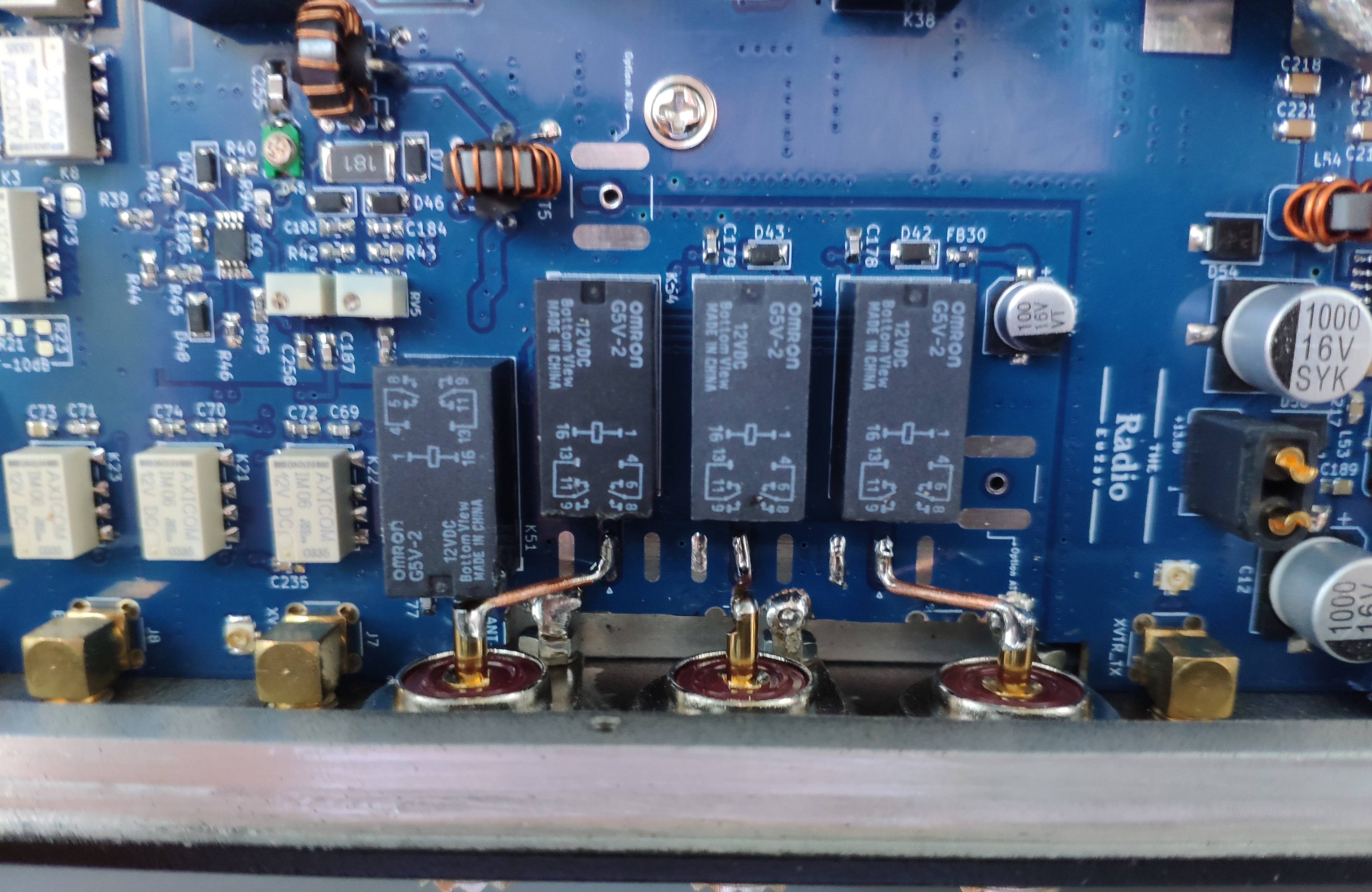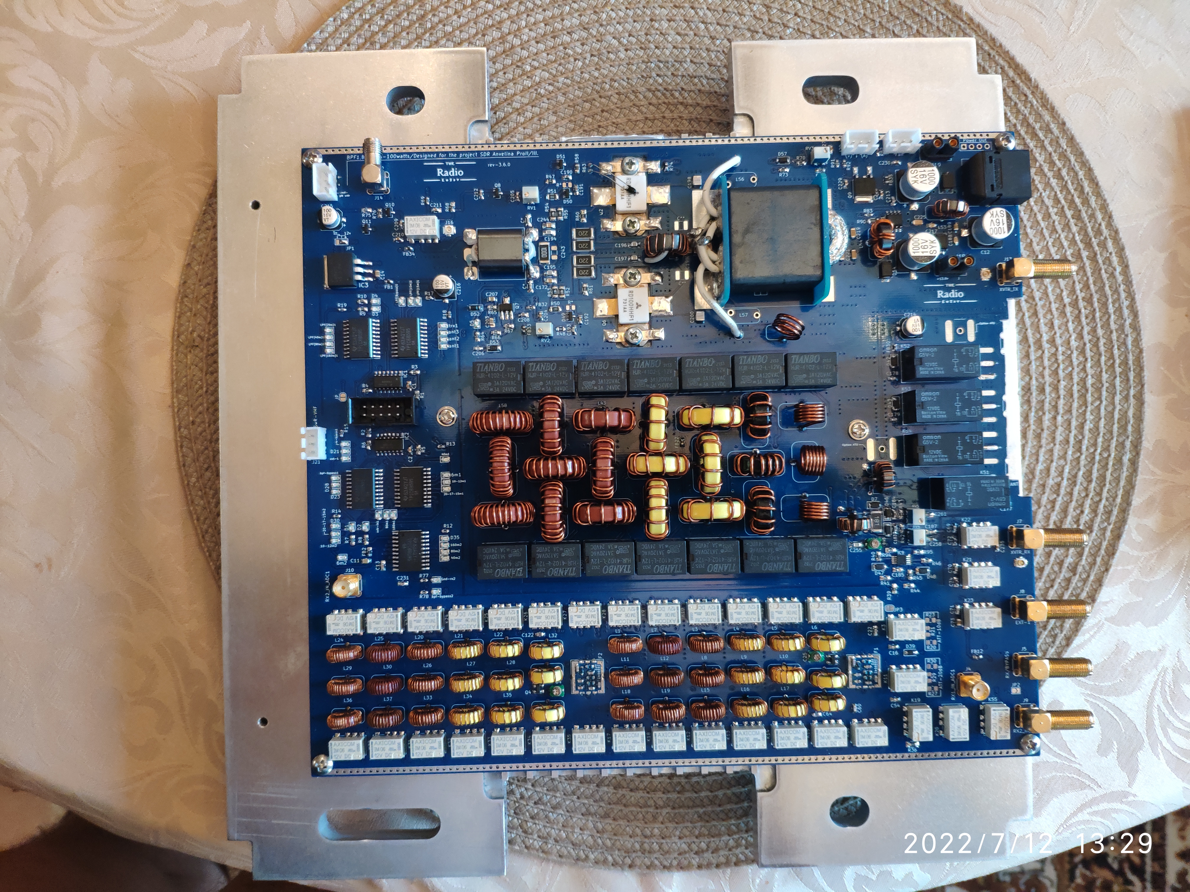 Here is another photo of the amplifier board, a current sensor and voltage measurements were added in the latest revisions. There is also a jumper on the board, when it is activated, the reverse mode turns on- that is, when we work on the VHF channel of the receiver RX2 is connected to the input RX1, so in VHF mode with the second receiver I can listen to 160-6m, which seemed very convenient to me. If the JP2 jumper is not soldered, everything will be by default (without reverse)